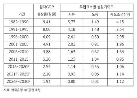 국회의 분석결과를 보면 잠재성장률이 9%였던 1981년~1990년까지 총요소생산성(TFP, total factor productivity)과 자본, 노동의 성장기여도는 각각 2.9%p, 4.6%p, 1.5%p였다. 하지만 1991~2000년도엔 잠재성장률이 7.2%로 줄어들고 각각의 기여도는 2.6%p, 3.9%p, 0.7%로 하락했다.