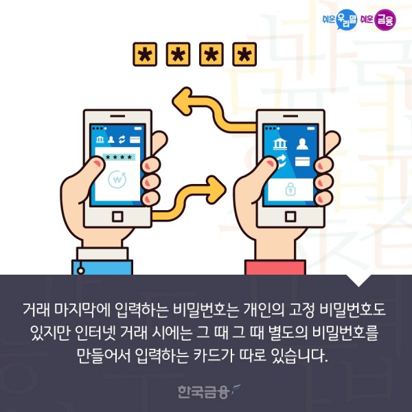 인터넷 거래 시에는 그 때 그 때 별도의 비밀번호를 만들어서 입력하는 카드가 따로 있습니다.