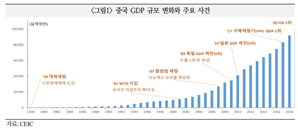 중국은 1949년 건국이래 계획경제를 시작한 이후 1978년 개혁개방을 통해 시장경제 요소를 도입해 국가자본주의를 발전시키면서 고도성장을 달성해왔다. 연구원들은 중국의 발전 단계를 3단계로 나눠서 볼 수 있다고 밝혔다.