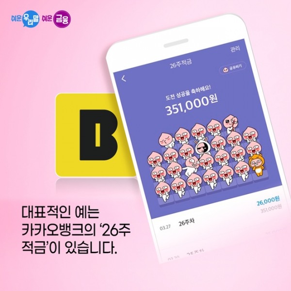 대표적인 예는 카카오뱅크의 ‘26주 적금’이 있습니다.