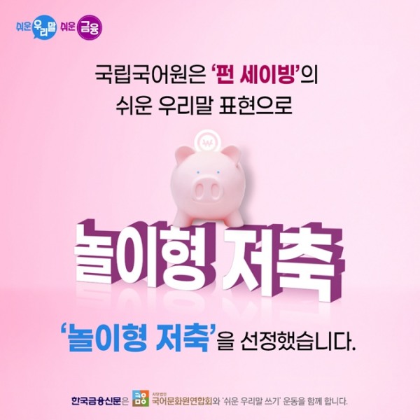 국립국어원은 쉬운 우리말 표현으로 ‘놀이형 저축’을 선정했습니다.
