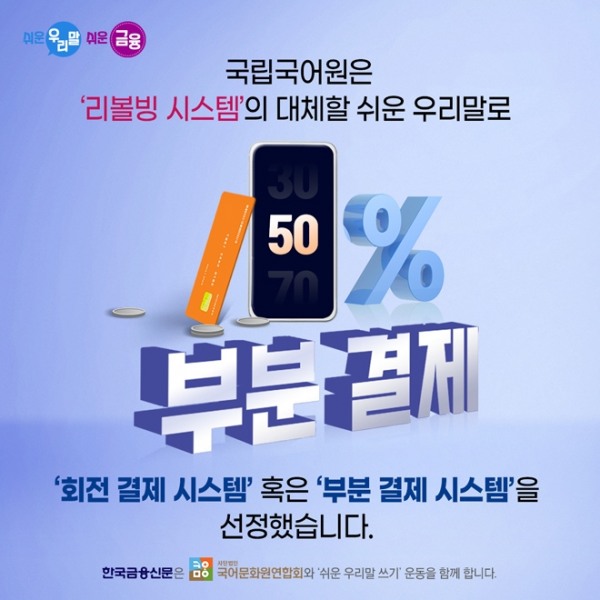 국립국어원은 ‘리볼빙 시스템’의 대체할 쉬운 우리말로 ‘회전 결제 시스템’ 혹은 ‘부분 결제 시스템’을 선정했습니다.