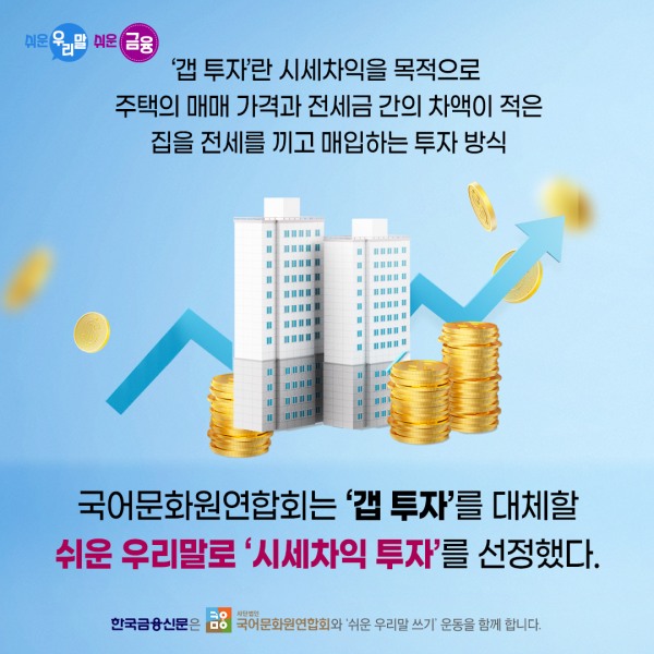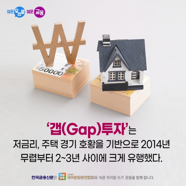 ‘갭 투자’란 시세차익을 목적으로 주택의 매매 가격과 전세금 간의 차액이 적은 집을 전세를 끼고 매입하는 투자 방식으로 국어문화원연합회는 ‘갭 투자’를 대체할 쉬운 우리말로 ‘시세차익 투자’를 선정했다.
