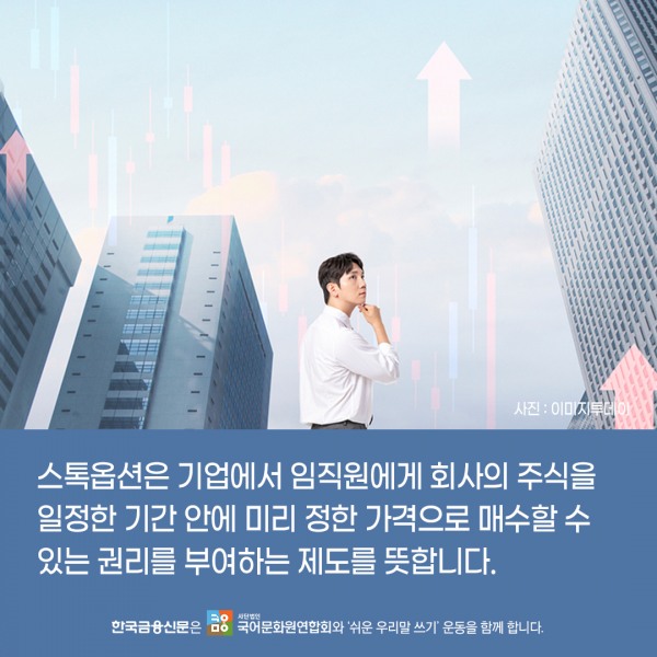 사실 스톡옵션은 영어로 구성된 말인 만큼 한 번에 와 닿지 않을 수 있습니다. 스톡옵션 단어를 하나씩 뜯어보면 ‘주식(stock)’과 ‘선택권(option)’이 합해진 말로, 우리말도 그 뜻을 살려서 표현할 수 있습니다.