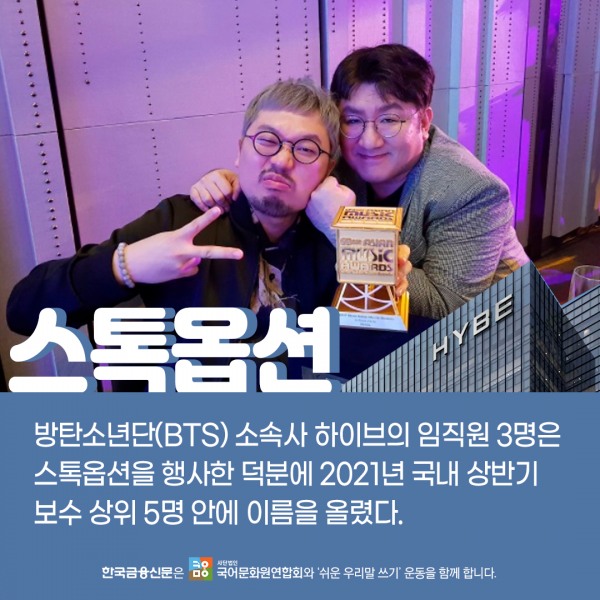 글로벌 보이그룹으로 떠오른 방탄소년단(BTS) 소속사인 하이브의 임직원 3명은 이 스톡옵션을 행사한 덕분에 2021년 국내 상반기 보수 상위 5명 안에 이름을 올렸다.