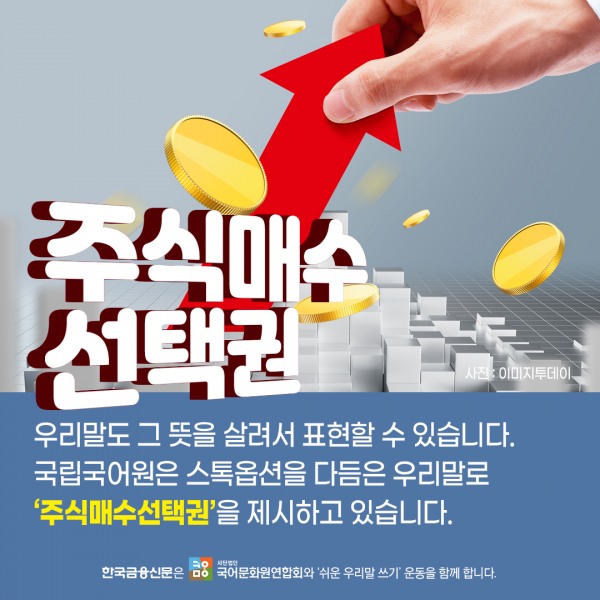 국립국어원은 스톡옵션을 다듬은 우리말로 ‘주식매수선택권’을 제시하고 있습니다.