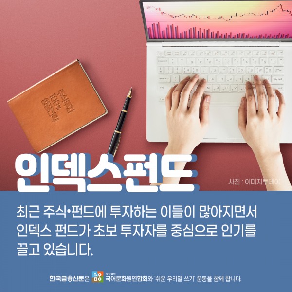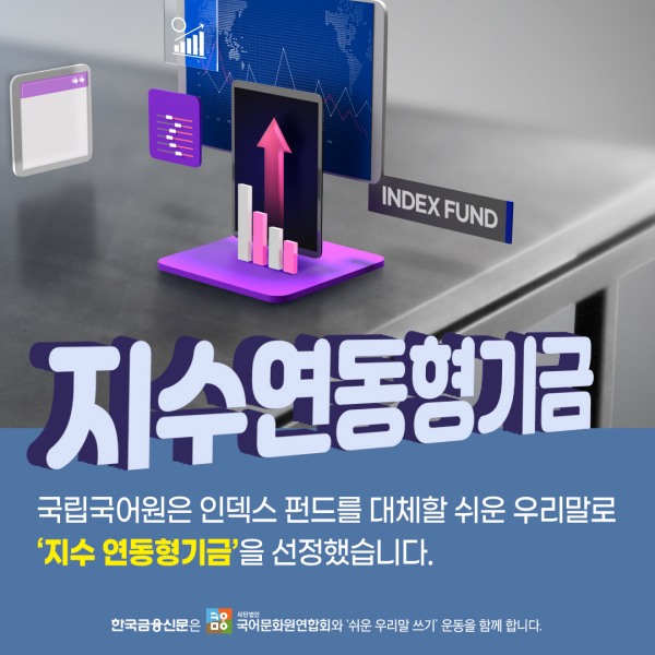 국립국어원은 ‘우리말 다듬기 누리집’을 통해 인덱스 펀드를 대체할 쉬운 우리말로 ‘지수 연동형기금’을 선정했습니다.