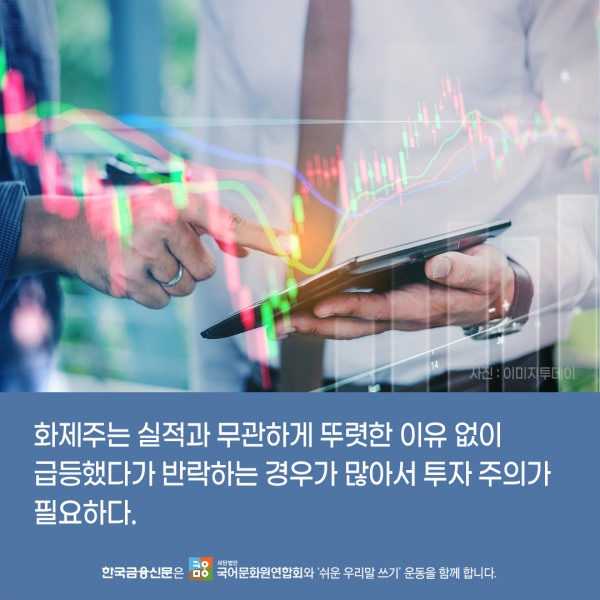 화제주는 실적과 무관하게 뚜렷한 이유 없이 급등했다가 반락하는 경우가 많아서 투자 주의가 필요하다.