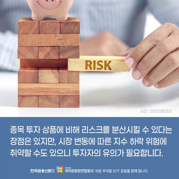 종목에 투자하는 상품에 비해 기업 고유의 리스크를 분산시킬 수 있다는 장점이 있지만, 시장이 대세 상승장일 경우 액티브 펀드의 성과에 비해 뒤처질 수 있습니다. 또 시장 변동에 따른 지수 하락 위험에 취약할 수도 있으니 투자자의 유의가 필요합니다.