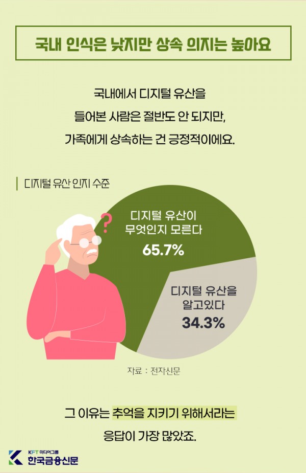 국내에서 디지털 유산을 들어본 사람은 절반도 안 되지만, 가족에게 상속하는 건 긍정적이에요.그 이유는 추억을 지키기 위해서라는 응답이 가장 많았죠.