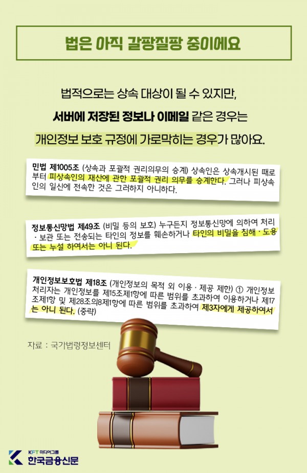 법적으로는 상속 대상이 될 수 있지만, 서버에 저장된 정보나 이메일 같은 경우는 개인정보 보호 규정에 가로막히는 경우가 많아요.사망자 계정 처리, 의무 아닌 권고 수준이에요