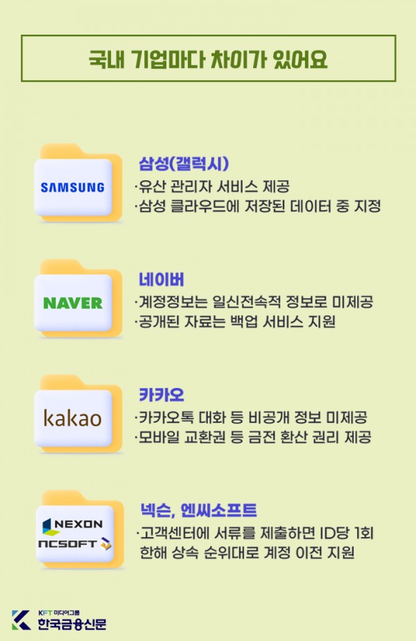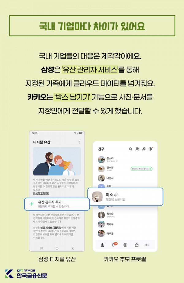국내 기업들의 대응은 제각각이에요. 삼성은 ‘유산 관리자 서비스’를 통해 지정된 가족에게 클라우드 데이터를 넘겨줘요. 카카오는 ‘박스 남기기’ 기능으로 사진·문서를 지정인에게 전달할 수 있게 했습니다.세계 시장은 이미 빠르게 성장 중이에요