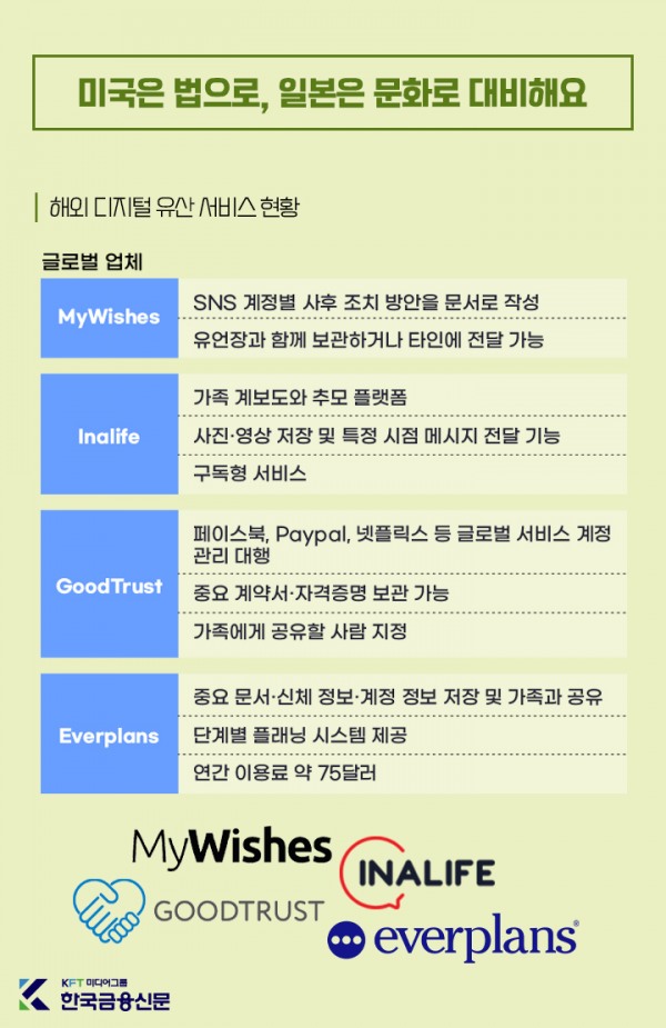 미국은 법으로 신탁을 통해 디지털 유산을 관리하고, 일본은 종활(終活) 문화 속에서 ‘디지털 세이프티 박스’같은 서비스를 운영해요.웰다잉 시대, 디지털 유산도 준비해 보세요