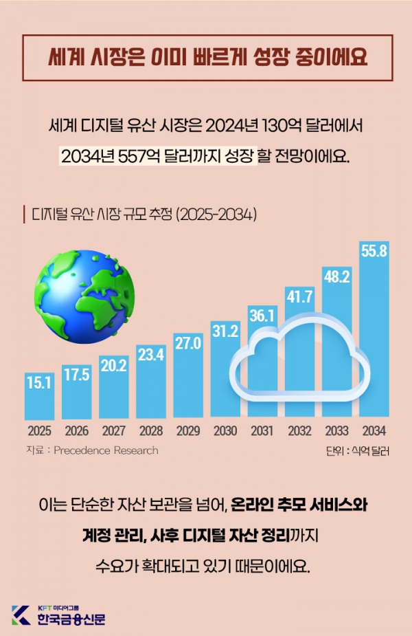 세계 디지털 유산 시장은 2024년 130억 달러에서 2034년 557억 달러까지 성장 할 전망이에요.이는 단순한 자산 보관을 넘어, 온라인 추모 서비스와 계정 관리, 사후 디지털 자산 정리까지 수요가 확대되고 있기 때문이에요.