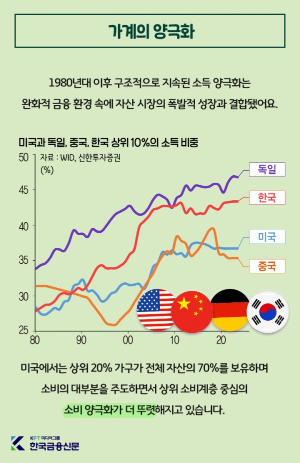 1980년대 이후 구조적으로 지속된 소득 양극화는 완화적 금융 환경 속에 자산 시장의 폭발적 성장과 결합됐어요.미국에서는 상위 20% 가구가 전체 자산의 70%를 보유하며 소비의 대부분을 주도하면서 상위 소비계층 중심의 소비 양극화가 더 뚜렷해지고 있습니다.