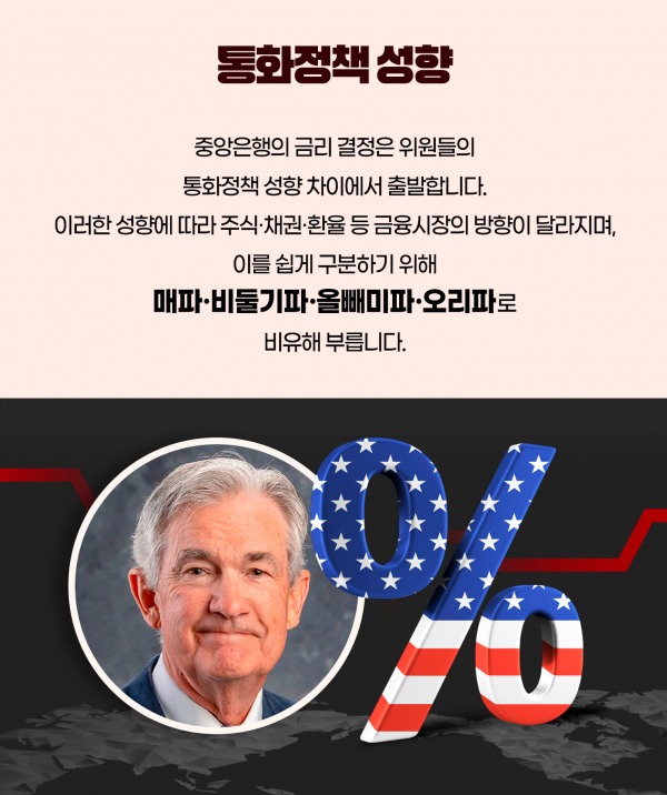 이러한 성향에 따라 주식·채권·환율 등 금융시장의 방향이 달라지며, 이를 쉽게 구분하기 위해 매파·비둘기파·올빼미파·오리파로 비유해 부릅니다.