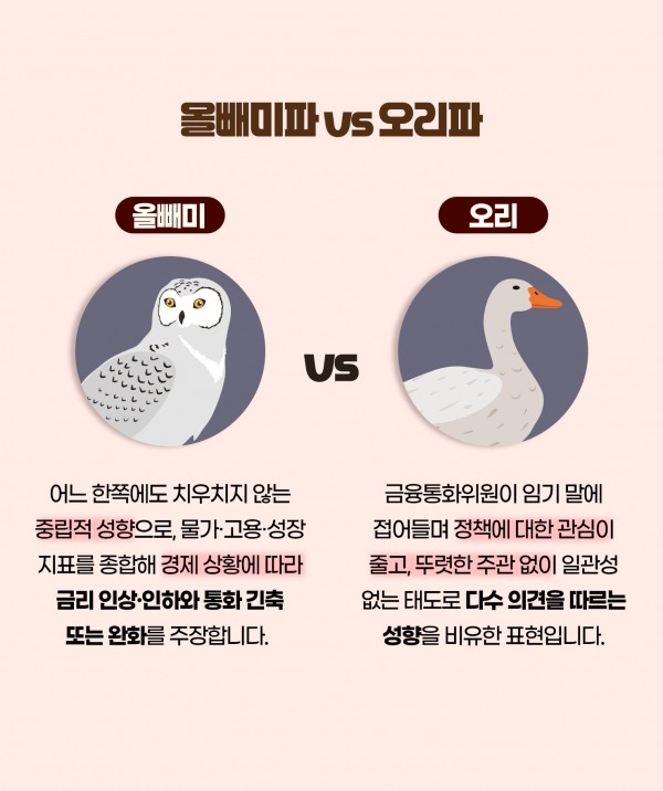 올빼미파 : 어느 한쪽에도 치우치지 않는 중립적 성향으로, 물가·고용·성장 지표를 종합해 경제 상황에 따라 금리 인상·인하와 통화 긴축 또는 완화를 주장합니다.