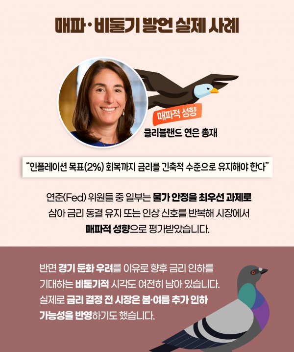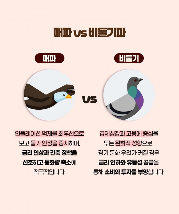비둘기파 : 경제성장과 고용에 중심을 두는 완화적 성향으로 경기 둔화 우려가 커질 경우 금리 인하와 유동성 공급을 통해 소비와 투자를 부양합니다.