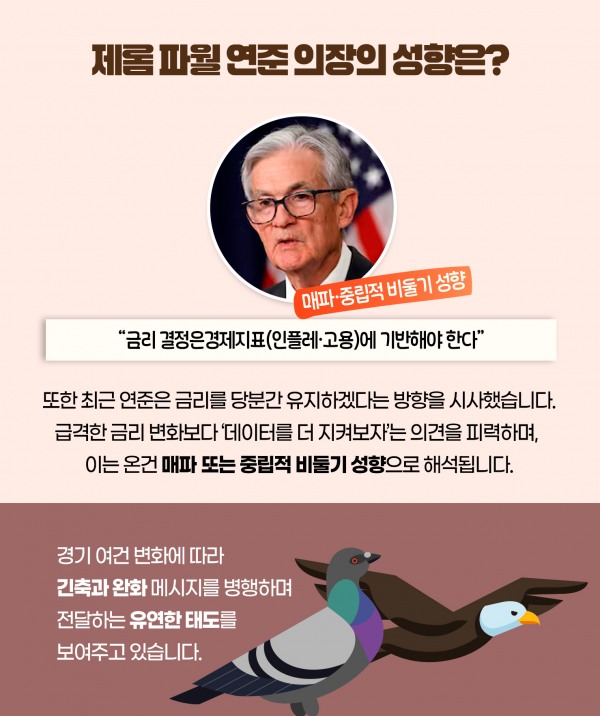 급격한 금리 변화보다 ‘데이터를 더 지켜보자’는 의견을 피력하며, 이는 온건 매파 또는 중립적 비둘기 성향으로 해석됩니다.