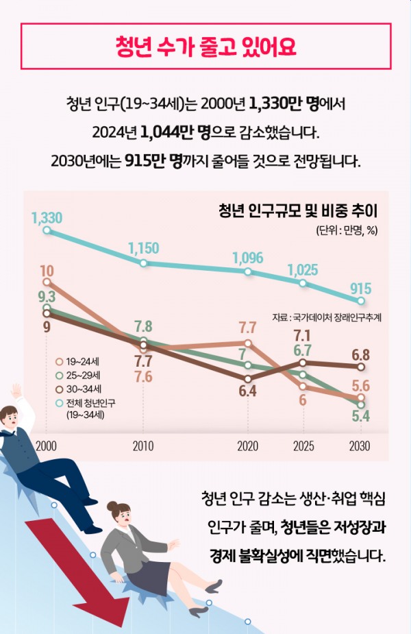청년 인구(19~34세)는 2000년 1,330만 명에서 2024년 1,044만 명으로 감소했습니다. 2030년에는 915만 명까지 줄어들 것으로 전망됩니다.