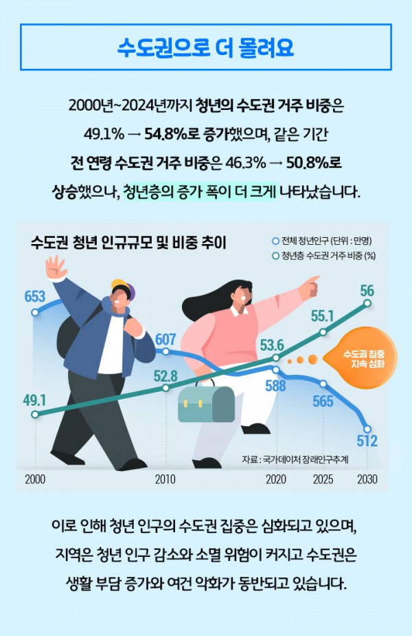 이로 인해 청년 인구의 수도권 집중은 심화되고 있으며, 지역은 청년 인구 감소와 소멸 위험이 커지고 수도권은 생활 부담 증가와 여건 악화가 동반되고 있습니다.