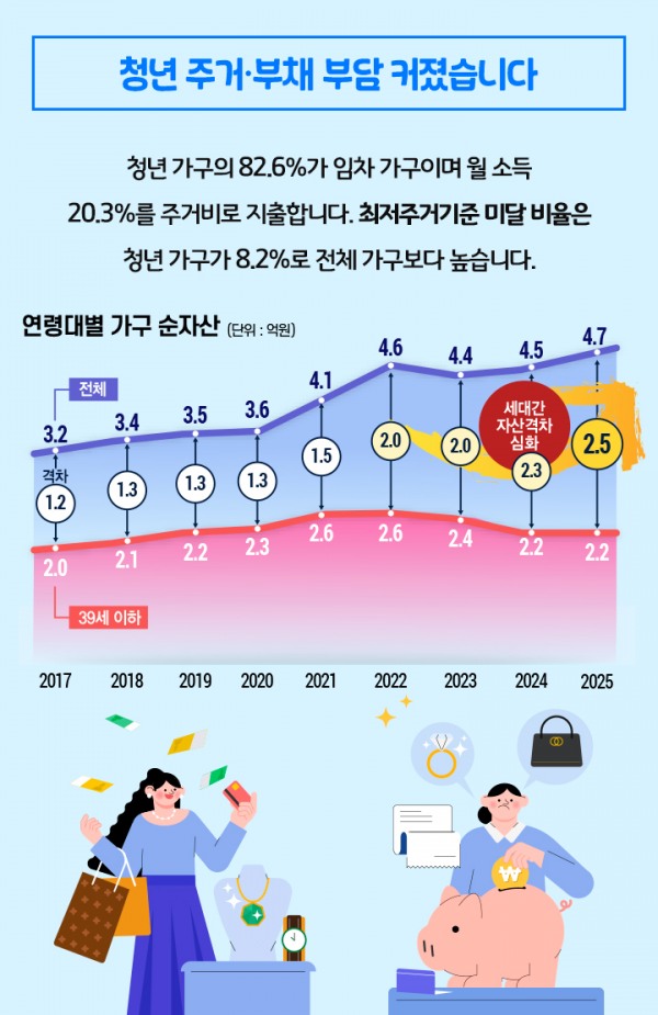 청년 가구의 82.6%가 임차 가구이며 월 소득 20.3%를 주거비로 지출합니다.