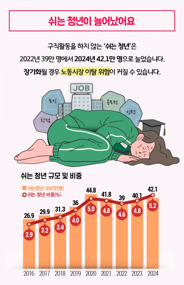 구직활동을 하지 않는 ‘쉬는 청년’은 2022년 39만 명에서 2024년 42.1만 명으로 늘었습니다.