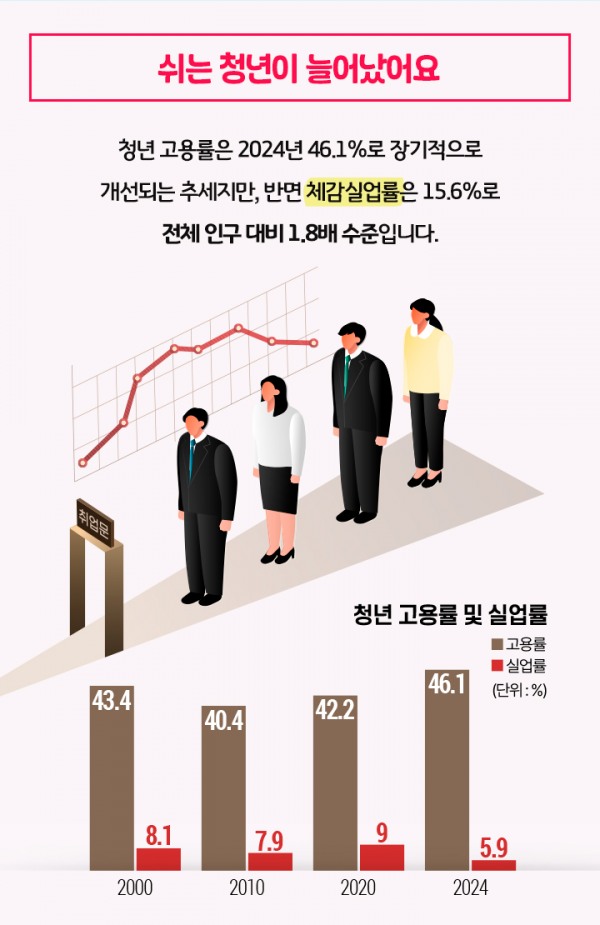 청년 고용률은 2024년 46.1%로 장기적으로 개선되는 추세지만, 반면 체감실업률은 15.6%로 전체 인구 대비 1.8배 수준입니다.