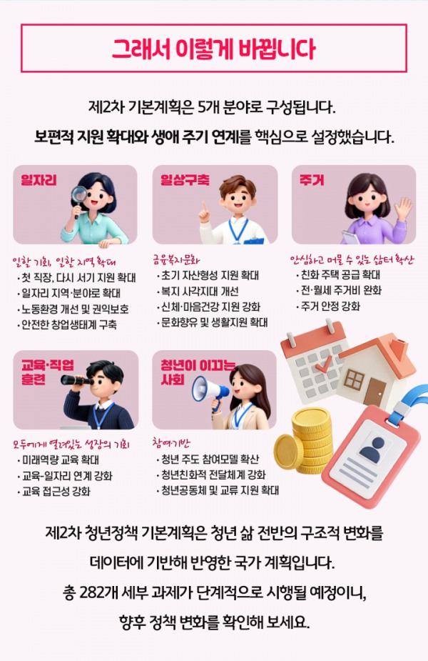 정부는 올해부터 2030년까지 5년간 일자리·교육·주거·복지·참여 전반을 아우르는 제2차 청년정책 기본계획을 추진합니다.