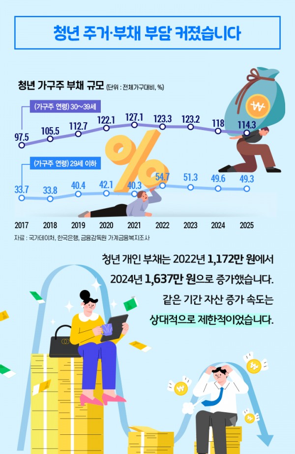 청년 개인 부채는 2022년 1,172만 원에서 2024년 1,637만 원으로 증가했습니다.